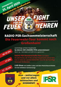Auf ihrer diesjährigen Feuerwehr-Tour kommt das PSR-Team am Donnerstag, 25. April 2024, ab 16:00 Uhr nach Großenhain auf den Hauptmarkt.