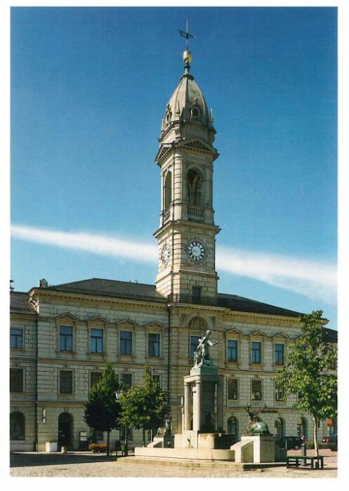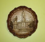 aus Holzzit, Wandteller mit Blick auf den Dianabrunnen und das Rathaus, 15 cm