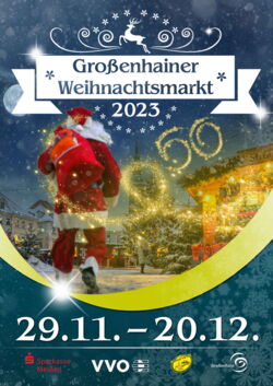 Vom 29. November bis 20. Dezember 2023 findet in Großenhain der diesjährige Weihnachtsmarkt zum 50. Mal auf dem Hauptmarkt statt. Rund 35 liebevoll gestaltete Stände laden die Gäste der Großenhainer Budenstadt zum Staunen und Kaufen ein. Für die kleinen Besucher stehen eine Rodelbahn, ein Karussell und eine Kinderbackstube bereit. Genießen Sie die vorweihnachtliche Atmosphäre mit ihren verführerischen Düften und lassen die schönsten Momente des Jahres Revue passieren. Wir freuen uns auf Ihren Besuch.