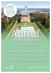 Am Sonnabend, 15. November 2025, findet der diesjährige Arbeitseinsatz im Barockgarten Zabeltitz statt. Wer Interesse und Lust hat, bei Pflanz- und Pflegearbeiten mitzumachen, den begrüßen die Mitarbeiter der Stadtverwaltung um 09:00 Uhr am Alten Schloss Zabeltitz im Schlosssaal. Dort erfolgt eine kurze Einweisung in die geplanten Arbeitsgruppen. Es werden praktische Pflegearbeiten im Park realisiert, deren Umfang durch die Zahl der Helfer bestimmt wird. Alle Zabeltitzer, Großenhainer und Gäste sind aufgerufen, mit einem eigenen Arbeitsbeitrag die weitere Pflege und Entwicklung des Barockgartens tatkräftig zu unterstützen.