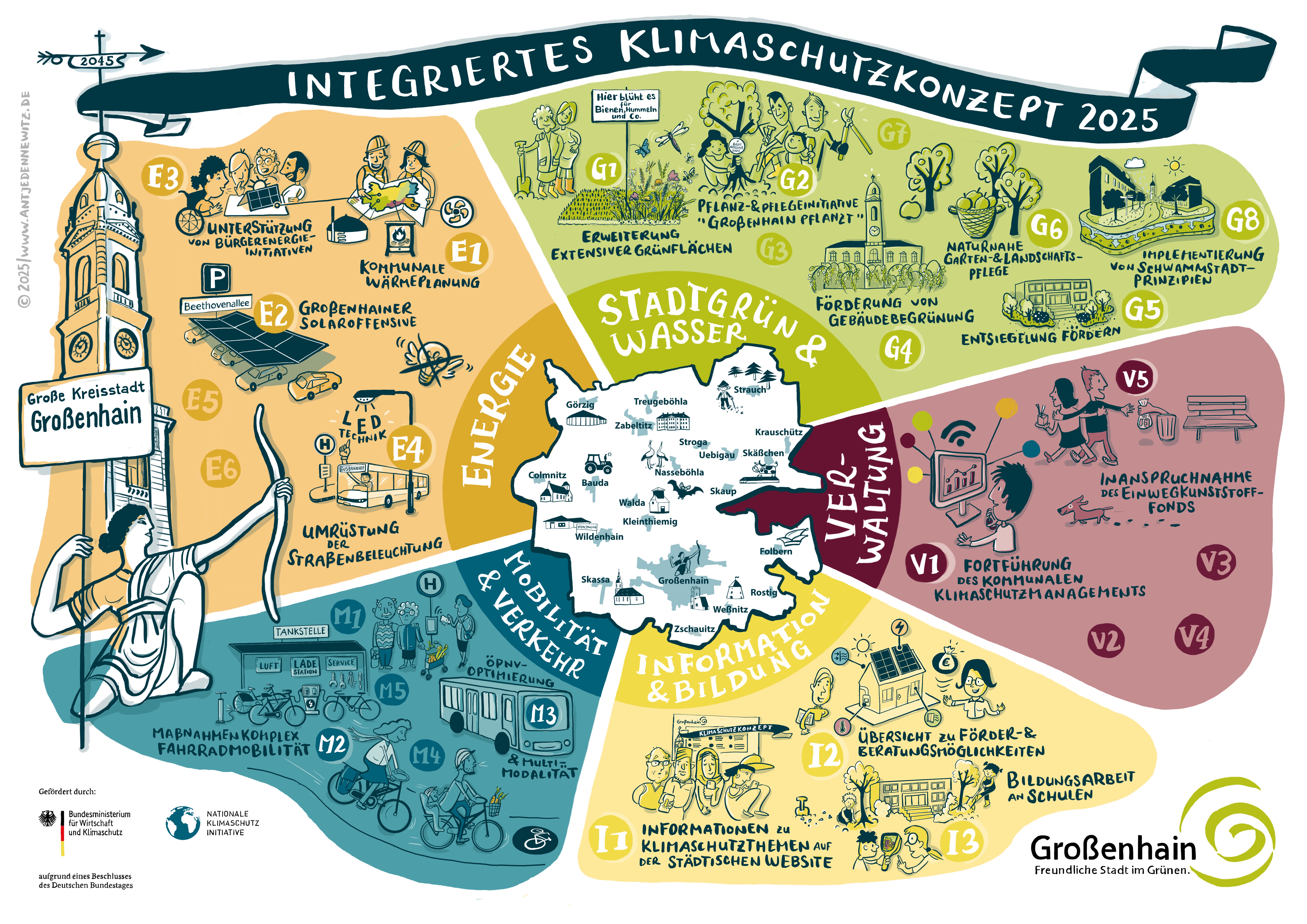 Von 2023 bis 2025 erarbeitete die Stadt Großenhain im Rahmen eines vom Bund geförderten Vorhabens (Nationale Klimaschutzinitiative, FKZ 67K21648 "Integriertes Klimaschutzkonzept Stadt Großenhain") ein integriertes Klimaschutzkonzept für das gesamte Stadtgebiet und die Ortschaften.